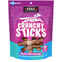 KOHA Crunchy Sticks Beef & Rice Recipe are an all-natural treat with only two ingredients: beef liver and highly digestible white rice. Dogs can't resist KOHA Crunchy Sticks!