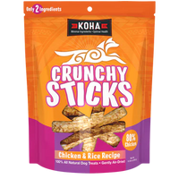 KOHA Crunchy Sticks Chicken & Rice Recipe are an all-natural treat with only two ingredients: chicken and highly digestible white rice. Dogs can't resist KOHA Crunchy Sticks!