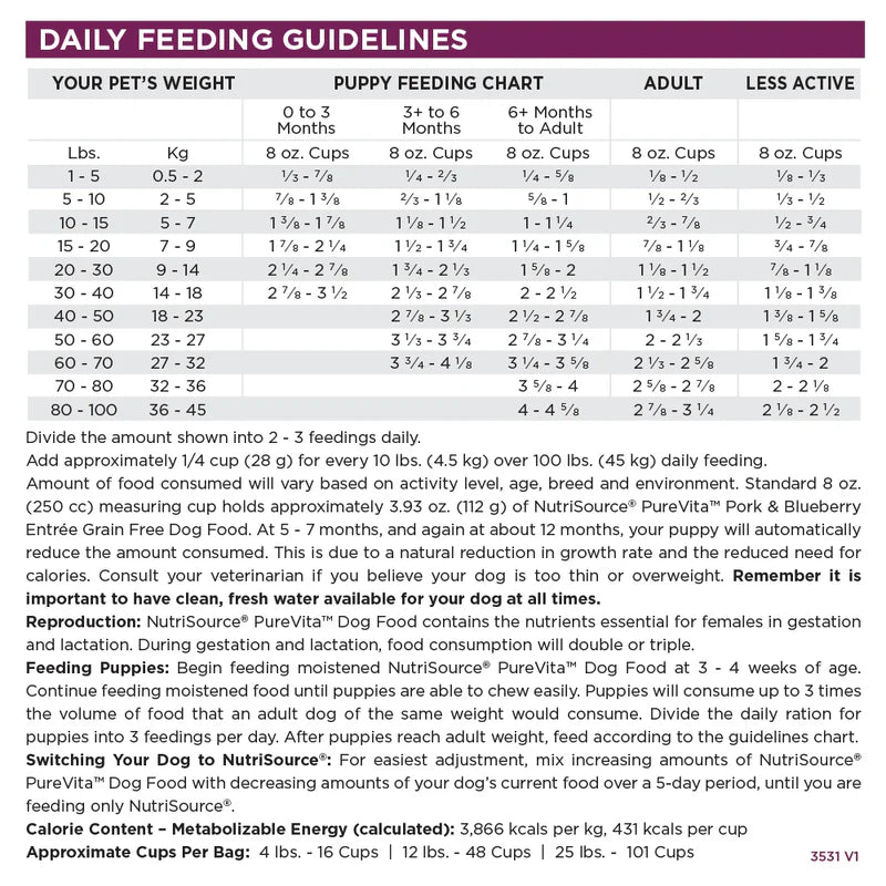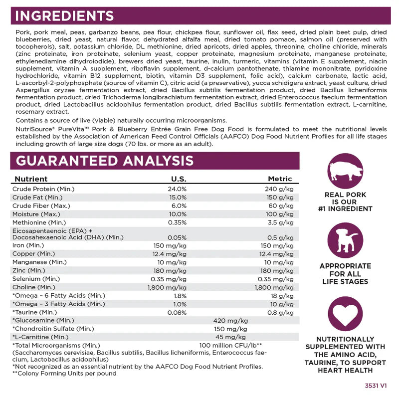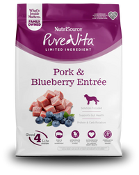 • As a member of our grain free series of dog foods, NutriSource® Pure Vita™ Pork & Blueberry Entrée is formulated to meet AAFCO guidelines for all life stages.
