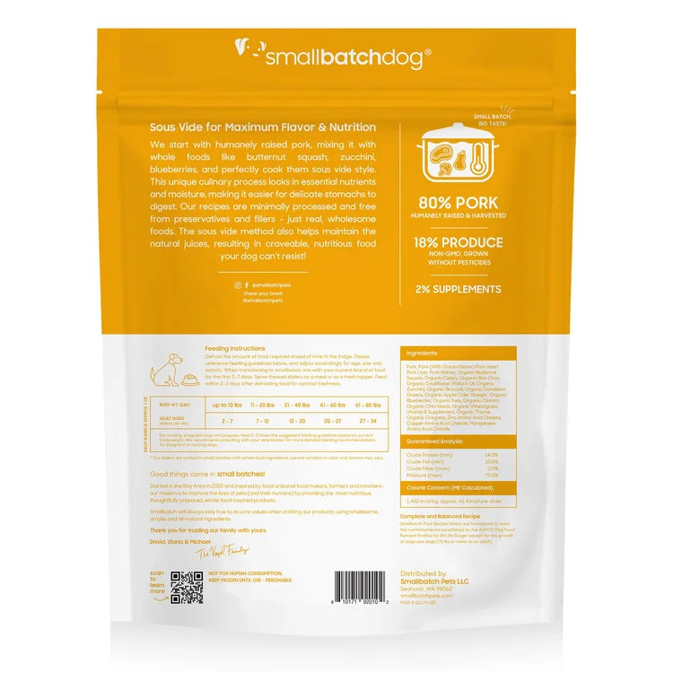 Complete and Balanced Recipe - Smallbatch Pork Recipe Sliders are formulated to meet the nutritional levels established by the AAFCO Dog Food Nutrient Profiles for All Life Stages except for the growth of large size dogs (70 lbs or more as an adult).