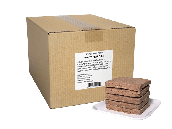 Steve’s Real Food frozen raw white fish dog food is our lowest-fat recipe in our lineup. The fish are sourced from fisheries certified by the Marine Stewardship Council (MSC), an organization that upholds rigorous standards for sustainable fishing and seafood traceability. This fish-based dog food is an excellent source of lean protein and omega-3 fatty acids to support a healthy coat, skin, and cognitive health. Our white fish raw dog food is also available in freeze-dried.